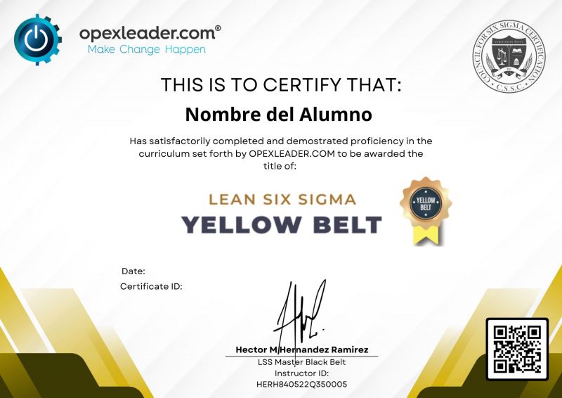 Con tu certificación Lean Six Sigma Yellow Belt estarás en condiciones de liderar mejoras puntuales y avanzar hacia Lean Six Sigma Green Belt, Black Belt y Master Black Belt. En OPEXLEADER.COM, con el Mtro. Héctor Hernández, Lean Six Sigma Master Black Belt, seguirás una ruta práctica y medible para crecer con impacto real.