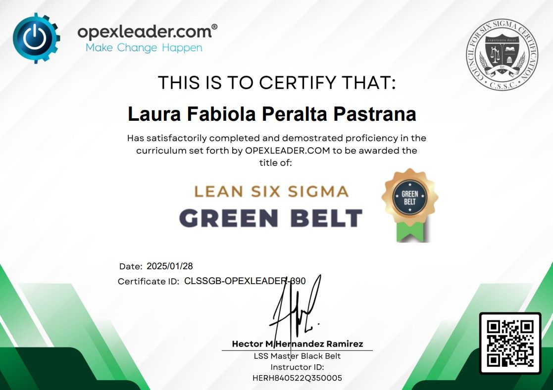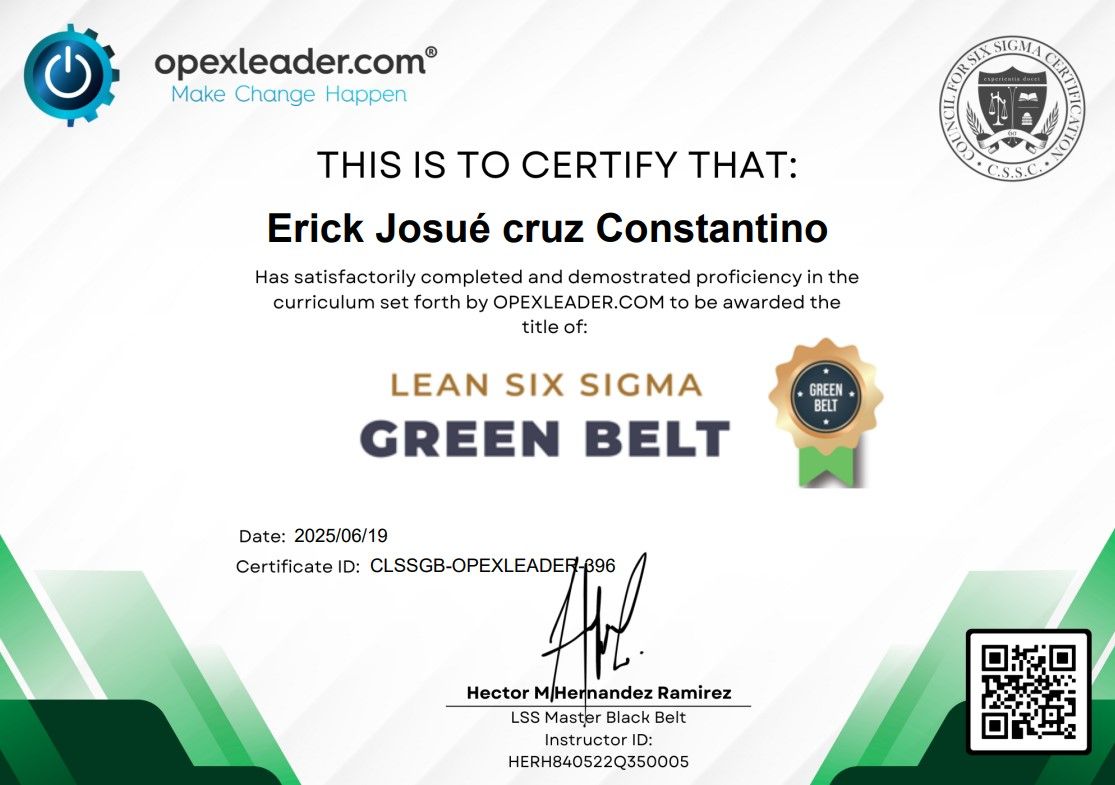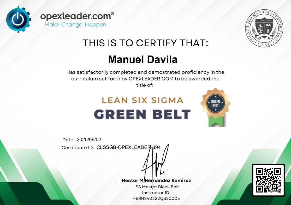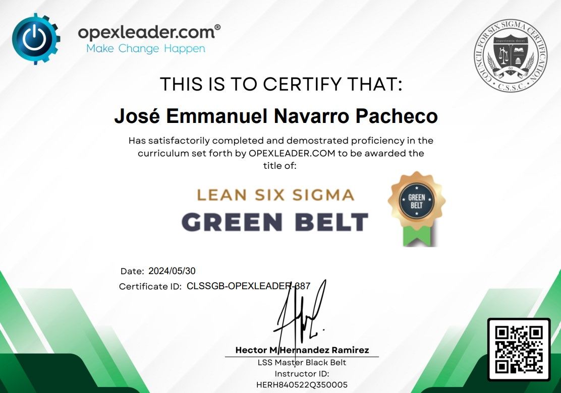 Con tu certificación Lean Six Sigma Green Belt estarás en condiciones de liderar proyectos de mayor alcance y avanzar hacia Lean Six Sigma Black Belt y Master Black Belt. En OPEXLEADER.COM, con el Mtro. Héctor Hernández, Lean Six Sigma Master Black Belt, consolidarás resultados con métricas claras y control estadístico.
